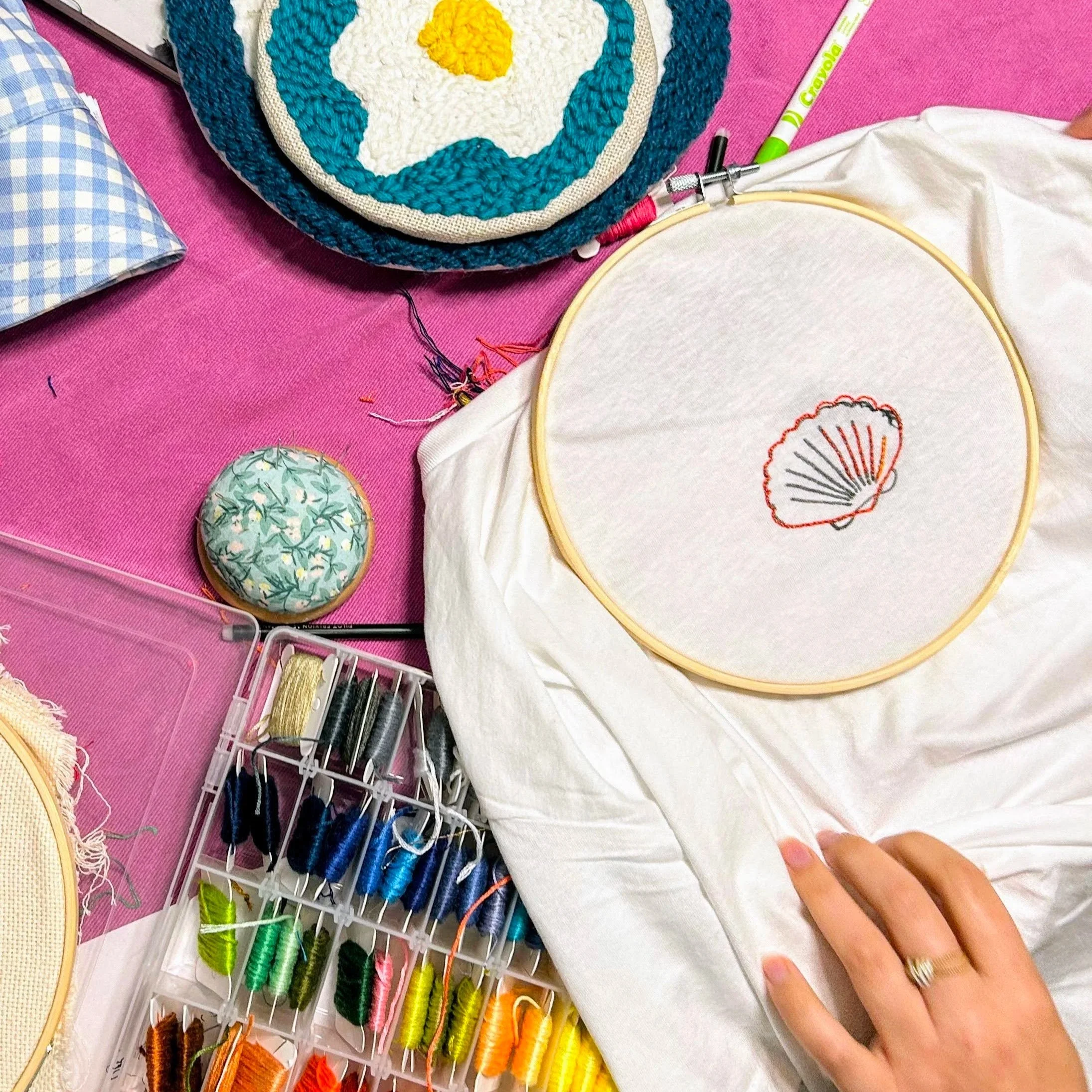 🧵 Atelier broderie sur tee-shirt – 2h30 Personnalisez votre tee-shirt (fourni) avec des motifs brodés uniques, guidé·e par Juliette. Accessible à tous niveaux, sans prérequis. Repartez avec votre création textile !